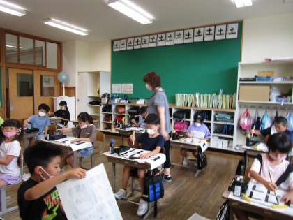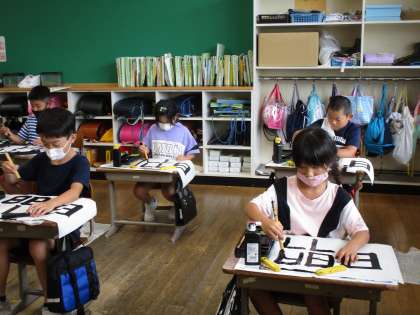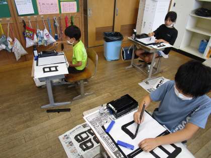 前回までに学習した「縦画」「横画」の技能を用いて、今日は「折れ」を学習しました。筆運びに手こずっていましたが、一生懸命きれいな字を書こうとがんばっています。