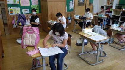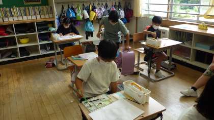 6年生の図工では、ランドセルを描いています。子供たちはランドセルの形や細かい縫い目までよく見て、本物のようにデッサンしました。ポイントを押さえながら描いた作品は上手に仕上がりました。
