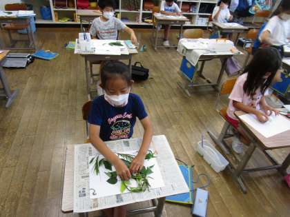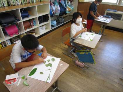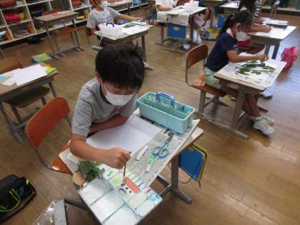 自然の葉を生かして絵を描いています。自然の色を自分たちでつくり、自由に発想しながら描き上げました。