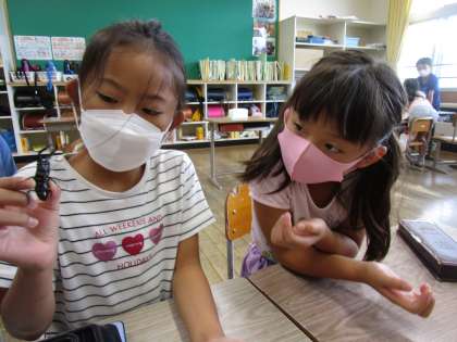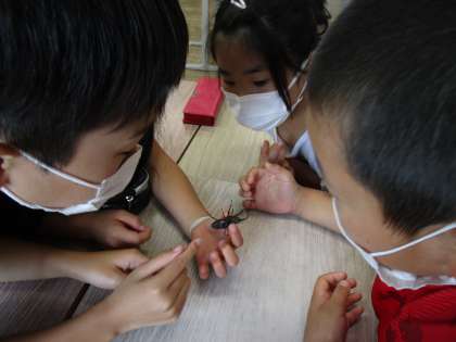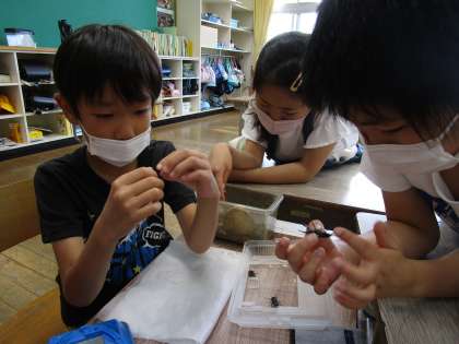 チョウを育てた学習を生かし、様々なこん虫の体のつくりを学びました。足の本数や、頭、むね、はらに分かれていることなど、チョウの体のつくりと比べながら学習しました。