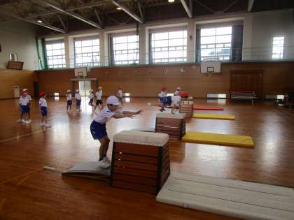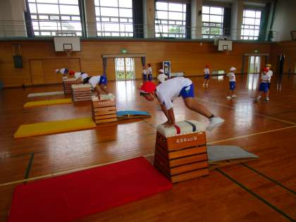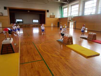 きれいに開脚跳びができるようにがんばっています。手の着く位置や踏切りの仕方等を工夫して跳んでいます。