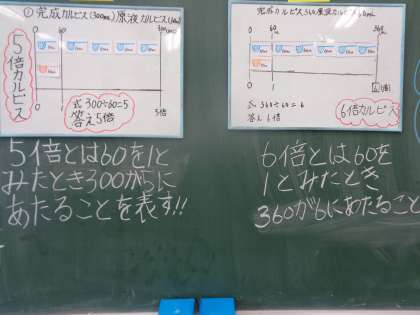 4年生の算数科では、「みんなでおやつを作って、おいしいパーティーをしよう!」の単元名のもと、「倍の見方」の学習をしています。今日は、校長先生に「倍の見方」を使って、7倍カルピスを作って届けました。図や式も上手にかけるようになっており、子供たちが想像以上によく考え、みんなで解いていく姿が見られ、とても嬉しく思っています。