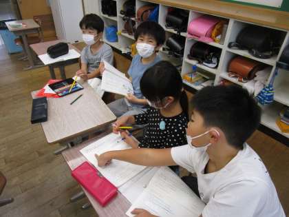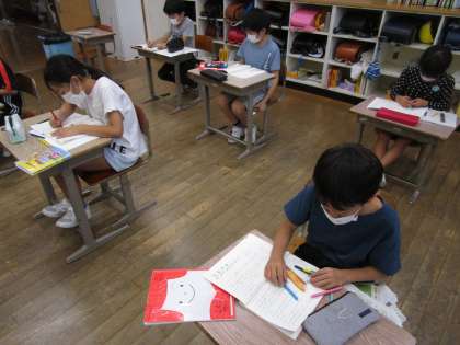 登場人物の気持ちを考えながら音読しています。今日は「 」のせりふを誰が話しているのか文章を根拠にして考えました。