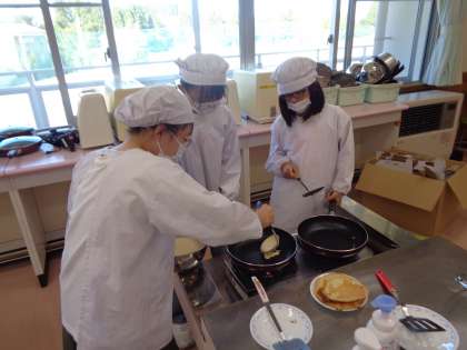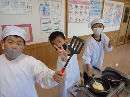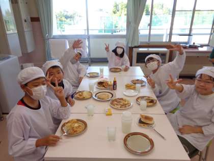 算数科の「倍の見方」の学習は「みんなでおいしいおやつをつくって、最高のパーティーをしよう!」の単元名のもと、学習を進めてきました。今日はついにパーティーをしました。授業のときに、みんなで問題を解いて完成させたレシピを使って、パンケーキ作りをしました。飲み物は、5倍カルピスです。みんなで考えて、作って、食べて、最高のパーティーになりました。