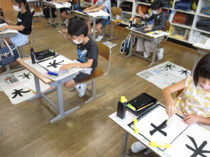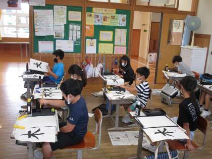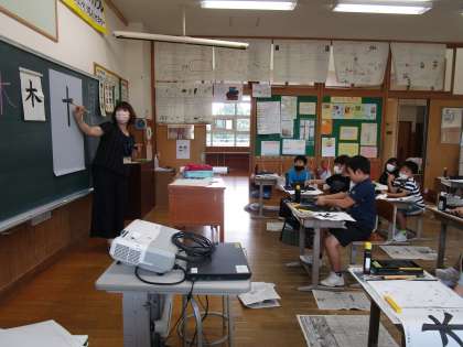木という漢字を書きました。右はらい、左はらいの書き方の違いを意識しながらていねいに書いています。書くときには集中し、口を閉じて静かに書くことができました。