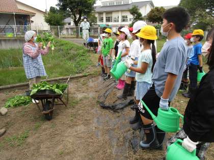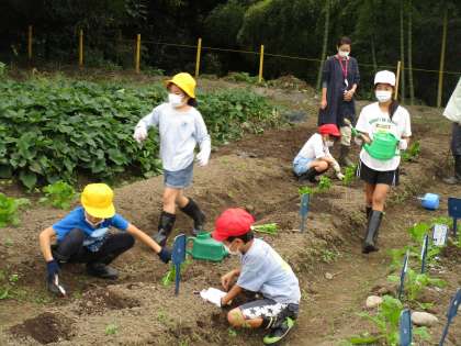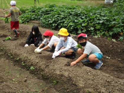 音川加工の方や地域の方に教えていただきながら苗植えと間引きを行いました。教えていただいたことを生かしてがんばっています。