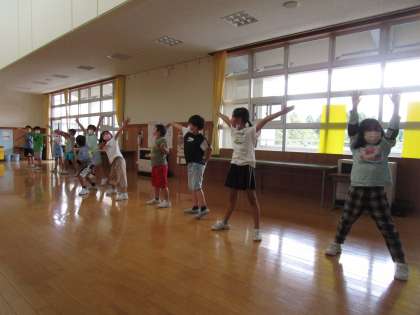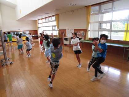 学習発表会に向けての表現運動をがんばっています。音楽に合わせてみんなでポーズを決めました。