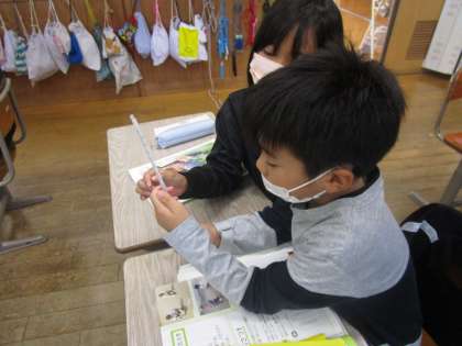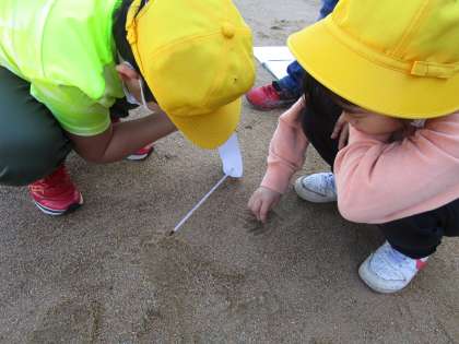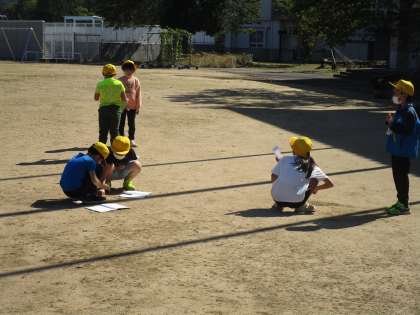日なたと日かげの様子や温度を比較しました。実際に温度計を用いて温度を比べて、日なたは日光によって地面が暖められるため、日かげよりも温度が高くなっていることに気付きました。