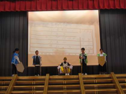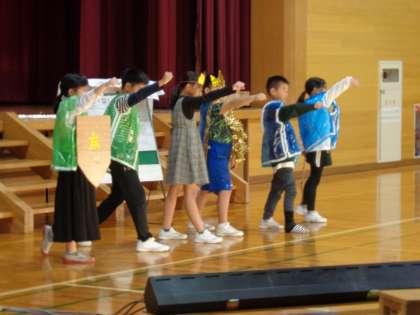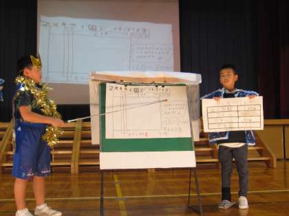 4年生は劇「算数でピンチを救え!」を披露しました。練習始めの頃とは、演じ方や声の大きさ、スピードが全然違い、本番では見ている人に分かりやすく演技をすることができました。