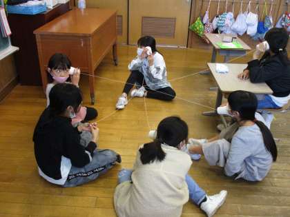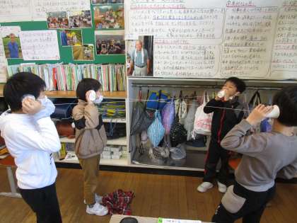 音が大きくなると、振動は大きくなるのかトライアングルを鳴らしながら調べました。また、音はどのように伝わるのか考え話し合った後、糸電話を使って音が伝わる様子を確認しました。