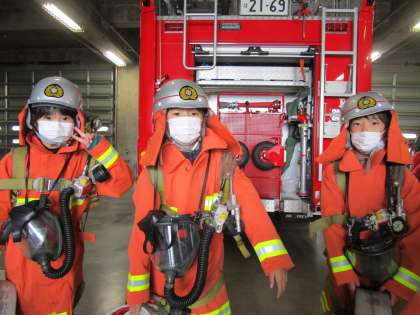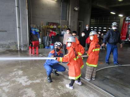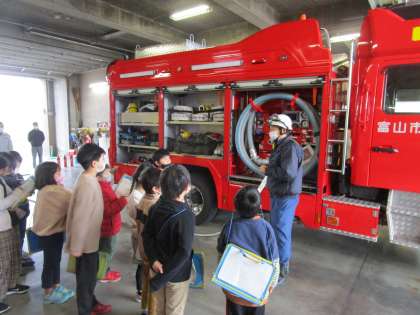 婦中消防署へ行き、消防士の仕事や施設の工夫について学習しました。実際に放水したり、車両を見学したりして、学びを深めました。