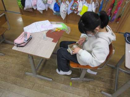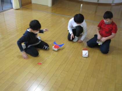 ゴムの力を使って動くおもちゃをつくりました。競走したり、自分のおもちゃのよさを伝えたりしながら、自分の求めるおもちゃをつくろうとがんばっています。