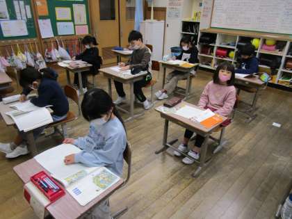 「三年とうげ」で学習した物語の組立てを意識し、たから島をぼうけんする物語を書いています。地図から想像を膨らませ、楽しい物語を考え文章で表しています。