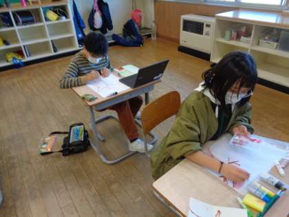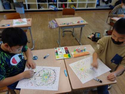 今日は、水彩絵の具と綿棒を使って、点描画を描きました。色使いが上手で、素敵な作品に仕上がりました。
