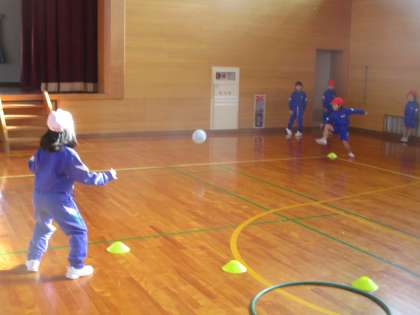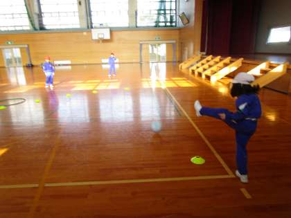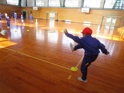 2学期の終わりから、少しずつボールの扱いに慣れてきた1・2年生。次は、ルールを決めて、赤白対抗「ボールけりゲーム」を行いました。「キックベースボール」の低学年版とはいえ、男子も女子も全力でボールを蹴って、勝利を目指して頑張っていました。