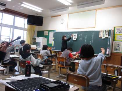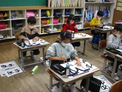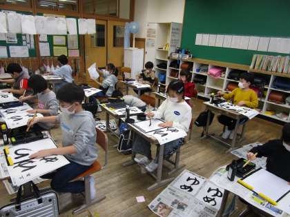 ひらがなの丸みを意識しながら書きました。筆の使い方を学び、ていねいに書いています。