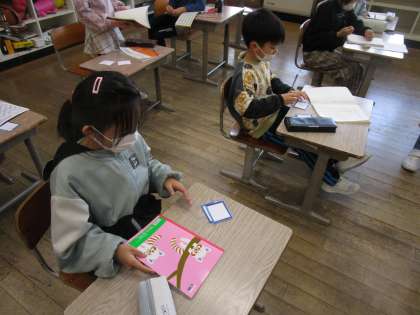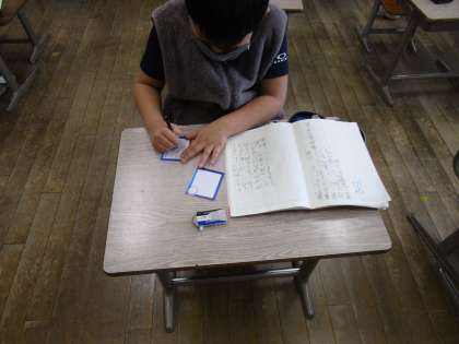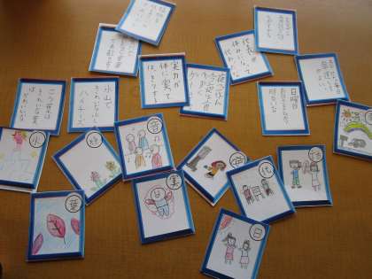 音読みと訓読みを復習し、クラスで音訓かるたを作成しています。一つの漢字の音読みと訓読みを意識しながら読み札をつくりました。