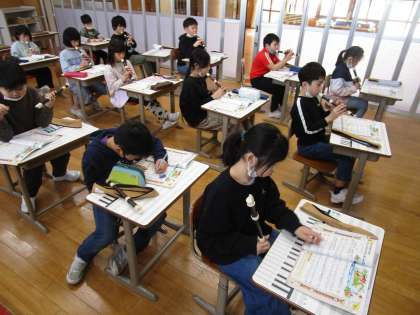 歌は、曲の山になる部分を意識しながら歌い、リコーダーは、鳴らすのが難しい「ミ」と「ファ」の音をきれいに出せるようにがんばっていました。