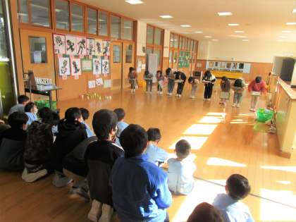来年度、新1年生として入学してくる子供たちを学校に招き、交流会を行いました。生活科の学習で作ったおもちゃでお店を開き、「ル−ル説明」「遊び方の演示」「時間や回数の計測」等、自分の役割をしっかり果たす1年生の姿に成長を感じました。来年度1・2年生として力を合わせて楽しい学校生活をつくっていってほしいと思います。