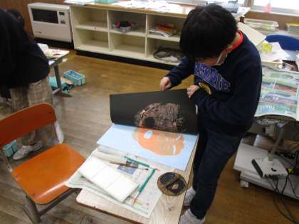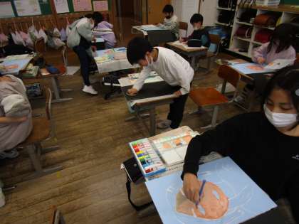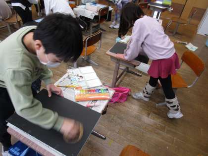 いよいよ彫刻刀で彫った板に、絵の具を乗せて刷っていきます。完成まであと少しです。
