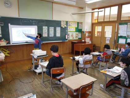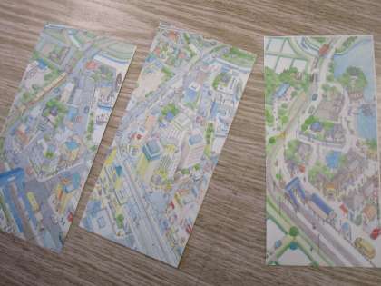 3枚のイラストを見て、時代が古い順番に並べ替えました。汽車が電車になっていたり、田や畑が埋め立てられていたり、建物の高さが高くなっていたりと、子供たちは様々な視点から根拠を見付け、友達に伝えました。