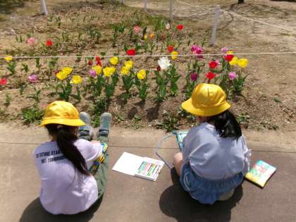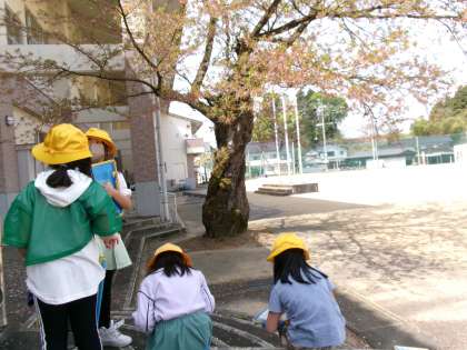 生活科の学習で、春見つけをしました。グラウンドのチューリップや、葉っぱが出始めた桜の木を見たり、虫を探したりしました。