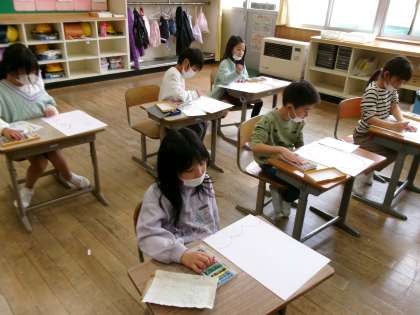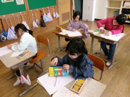 図画工作科では、何が生まれるか、自分だけが知っている「ひみつのたまご」を描きました。たまごから何が生まれるのか想像しながら描いた、世界に1つだけのたまごになりました。