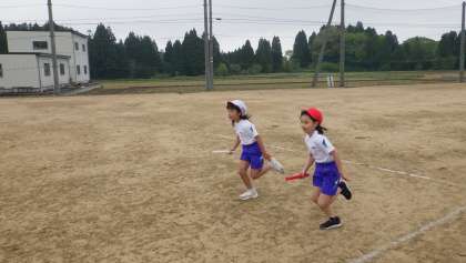 体育ではリレーの学習を始めました。3年生にとっては、バトンを使うことが初めてでした。2チームともバトンを落とすことなく、つなぐことができました。