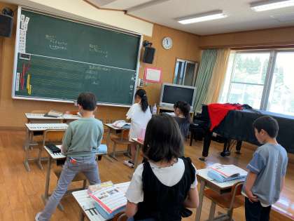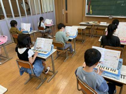 鍵盤ハーモニカで指またぎ、指くぐりの練習をしました。