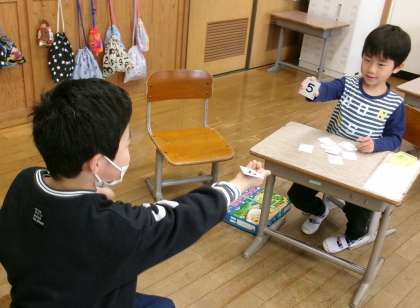 今日の算数の授業では、教科書にかいてある絵の数を数えたり、数カードを使って友達と「どちらが大きいかな対決」をしたりしました。友達と自分の数カードを比べ、楽しく、よく考えて対決をしていました。
