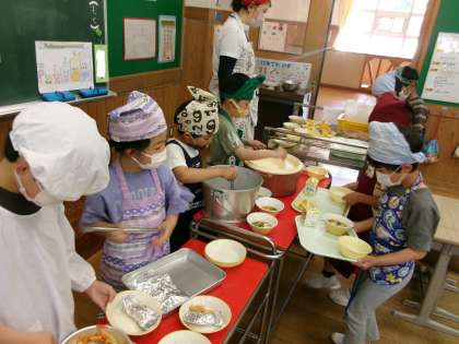 給食準備にもだいぶ慣れてきました。配膳がとても上手になっています。毎日給食時間を楽しみに待っている1年生です。