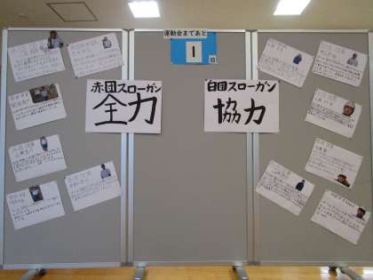 児童玄関前の掲示物です。6年生が作成しました。登校した子供たちは毎朝、この掲示板を見て運動会への思いを高め、今日まで一生懸命取り組んできました。