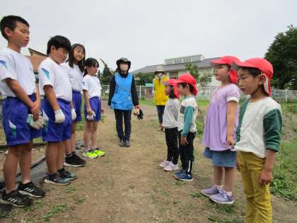 音川保育所の年長児とさつまいもの苗植えをしました。年長児に「すごいね」「上手だね」「こうしたらいいよ」等、優しく声をかけたり、植え方を丁寧に教えたりする姿が見られました。