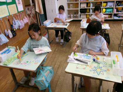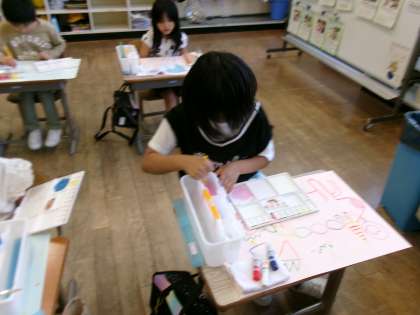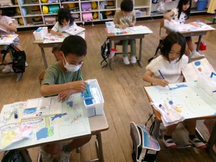 図画工作科の学習の続きで、たまごから生まれてきたものに色をつけました。色を混ぜたり、水の量を調節したりして、塗り方を工夫しました。友達のつくった色や塗り方を見て、新しい色を発見することを楽しんでいました。