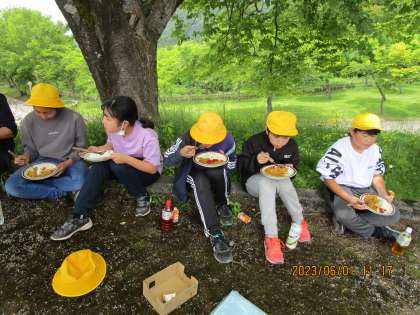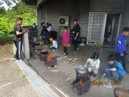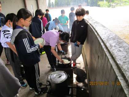 野外炊飯の様子です。美味しいカレーライスを作ろうと、班の友達と協力しながら活動する姿が見られました。