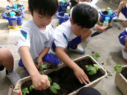 アサガオの芽が大きく育ってきたため、間引きを行いました。根が切れないように、そっと芽をすくい上げていました。