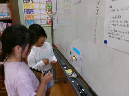 図書委員会では、「図書パズル」の企画を始めました。本を借りるとパズルのピースがもらえ、ピースをはめていくと、1枚の絵が仕上がります。今日は初日ということもあり、多くの音川っ子が本を借りにきました。ある学級では、お知らせを聞いて「パズルを完成させるぞー!」と気合いが入っていました。