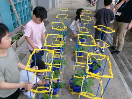 先週に比べ、あさがおが大きく成長し、つるが伸びてきました。成長に備えて、支柱をたてました。