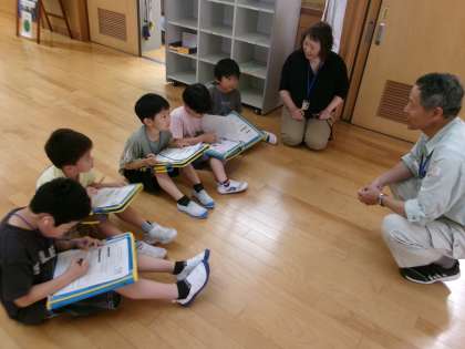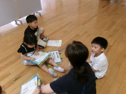 今日は先生と仲良くなるために、インタビューをしました。仕事内容や好きな○○を聞き、先生について詳しくなることができました。また、初めてのインタビューに「ドキドキする〜」と緊張気味でしたが、楽しくインタビューしていました。「せんせいとなかよし」第一弾、大成功です。