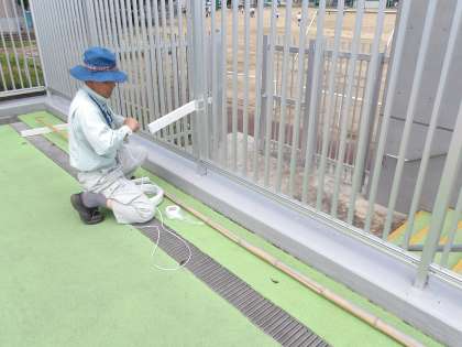 この写真は、プール開きの前に、用務員がタオルかけを設置しているところです。プール学習の際に、子供たちがタオルを手に取りやすいようにと準備しました。