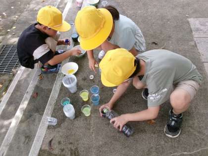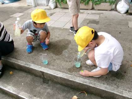 今日は、カラフル色水をつくって遊びました。ペットボトルに水を入れ、キャップに絵の具を塗って、シャカシャカ。すてきな色水ができました。また、友達の色水と自分のを混ぜると、さらにすてきな色ができました。「次はどんな色を作ろうかな」と、色水遊びを楽しんでいました。