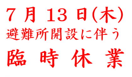 つきましては、本日7月13日(木)は臨時休業と致します。なお、お子様につきましては、ご自宅または避難所で安全にお過ごしいただきますようお願い致します。