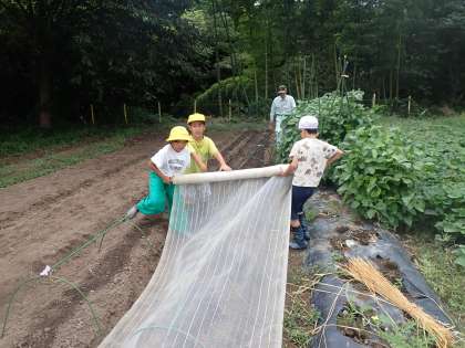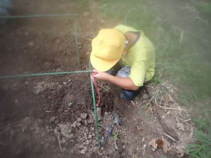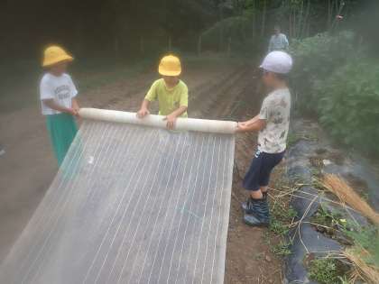 大かぶの芽が出たので防虫対策として学校にある防虫ネットをかけました。
