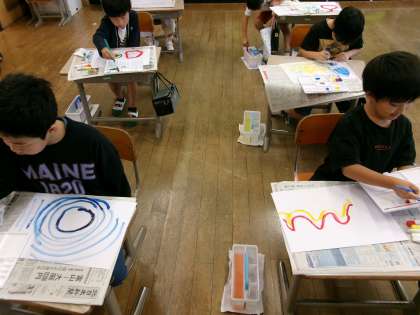 2回目の水彩画の学習でした。今日は、絵の具で線をかきながら、思い思いの絵に仕上げていました。