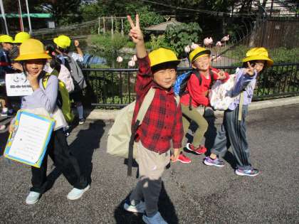 1、2年生合同でファミリーパークへ校外学習に行きました。動物を見たり飼育員さんに質問したりしながら、動物に親しみました。また、今日は山田小学校さんとも活動する時間がありました。同じグループの友達と、昼食を食べたり遊んだりしながら、仲良く交流することができました。動物や友達、先生たちと「にこにこ」「つながる」校外学習となりました。