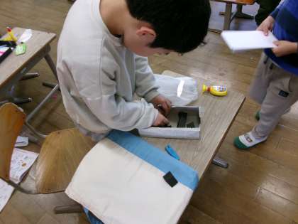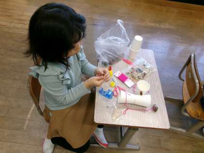 生活科では、あきのおもちゃづくりをしています。みんなで遊べるような、秋らしいおもちゃを一人一人考えて作っています。友達のおもちゃを参考にしながら、「もっと作りたい」「もっとおもちゃを大きくしたい」と、どんどんレベルアップしています。