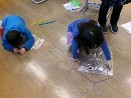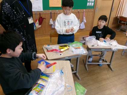 図画工作科でひらひらゆれる作品を作りました。どんな作品にしようか、よく考えて楽しく活動しました。今、窓の近くにかざってある子供たちの作品は、とても楽しそうにひらひらゆれています。
