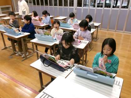 音楽では、ペアを作り、パートに分かれて鍵盤ハーモニカを演奏しました。指の使い方や息の吹き込み方を何度も練習する姿が見られました。ペアの友達と一緒にひとつの楽曲を演奏することを楽しんでいます。