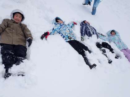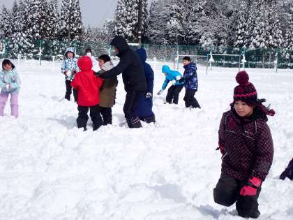 グラウンドにある雪で思いっきり遊んでいました。かまくらを作ったり、大きな雪だるまを作ったり、雪合戦をしたりしていました。