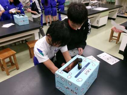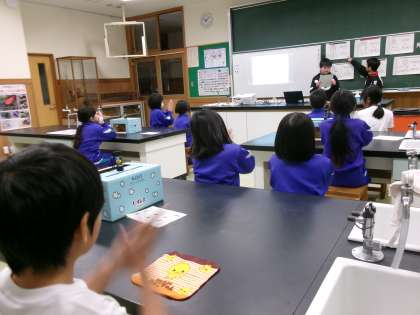 健康委員会の4、5、6年生と一緒に、正しい手洗いについて考えました。普段から学校でも聴いている手洗いの歌に合わせて、手の洗い方を復習しました。しかし、特別な液をつけてからもう一度手洗いをした後にブラックライトで手を照らしてみると、汚れが落ちていないところが一目で分かりました。子供たちは、自分がよく洗えていなかった箇所を入念に洗いました。